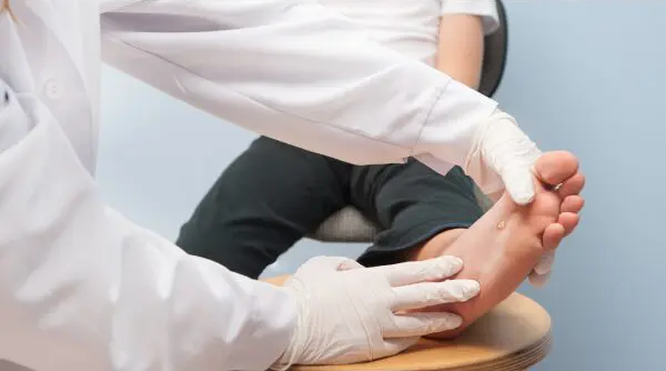 Zdjęcie przedstawia Podologa badającego stopy pacjenta