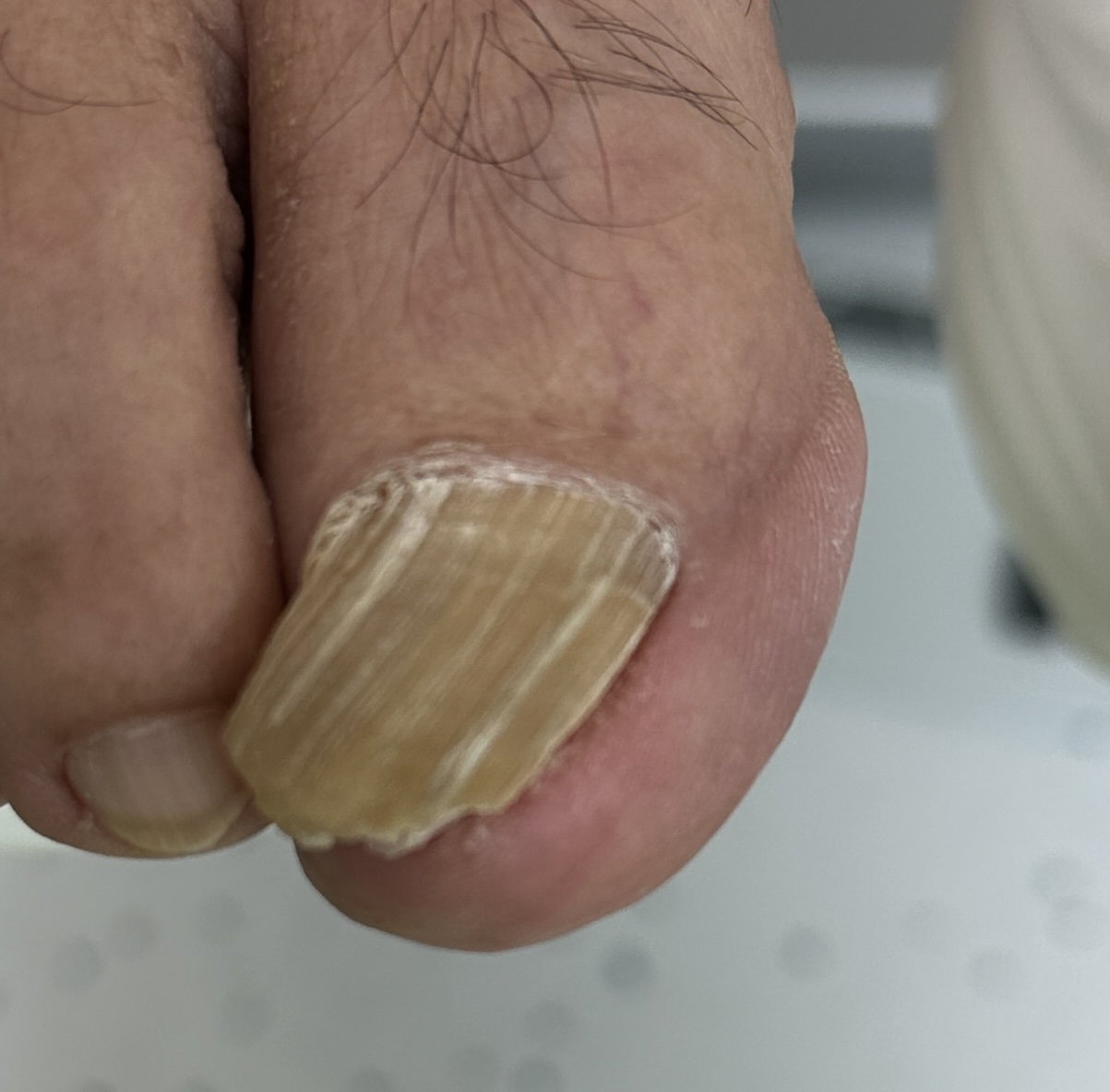 Zabieg opiera się na usunięciu nachodzących na siebie części płytki lub jeśli paznokcie w obrazie klinicznym posiadają jedynie poprzeczne pęknięcia to wygładzenie ich specjalnie dobranymi frazami. Jeśli zachodzi taka potrzeba, można nałożyć cienką warstwę masy do rekonstrukcji, aby paznokieć był spójny. Podolog monitoruje proces wzrostu paznokcia spotykając się z pacjentem na wizytach kontrolnych co mniej więcej 4-5 tygodni. Zaleca także stosowanie preparatów wzmacniających i nawilżających łożysko i paznokieć oraz wygodne obuwie. Rokowanie jest zwykle dobre, a płytka odrasta prawidłowo w ciągu kilku miesięcy.