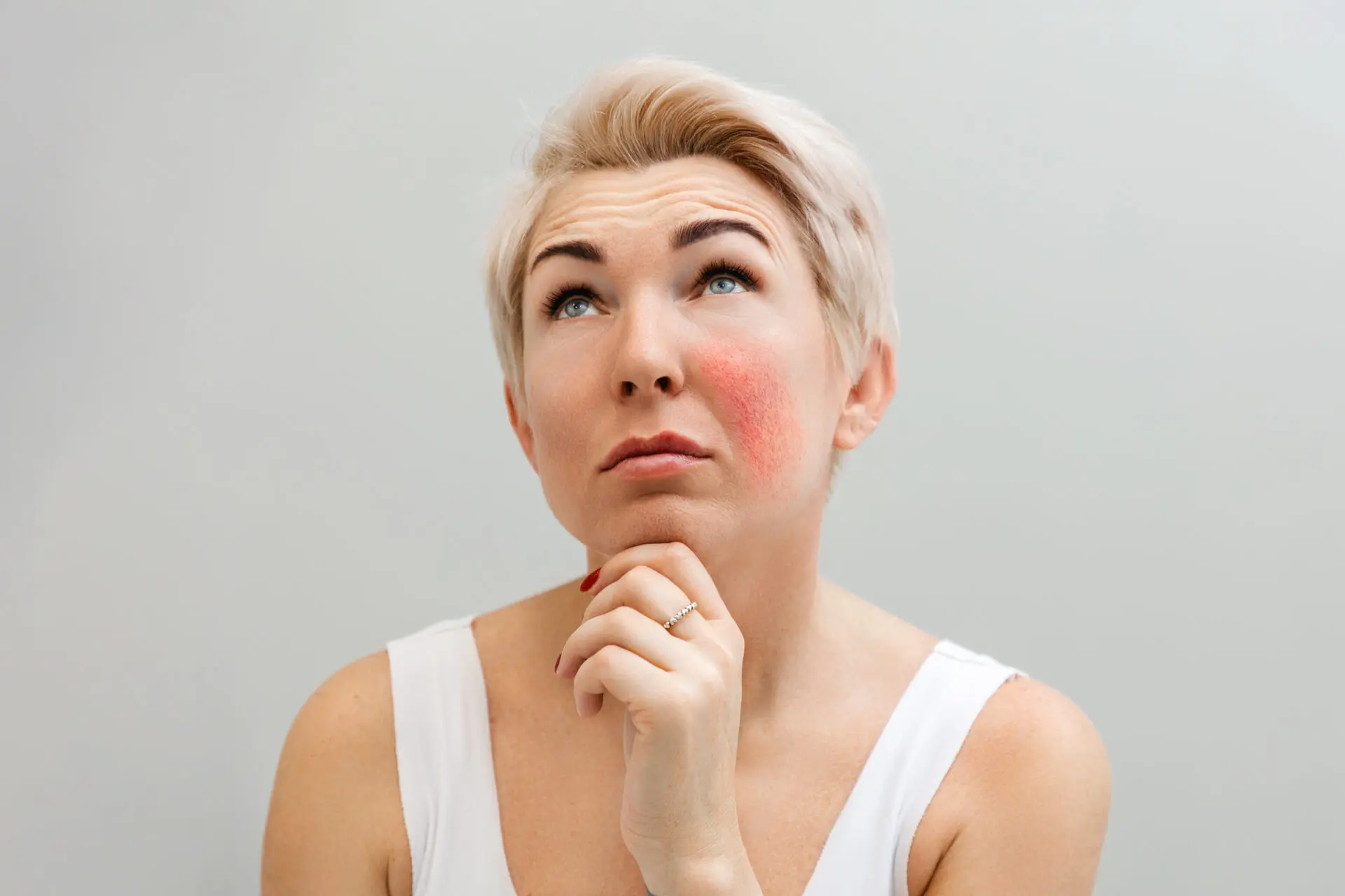 Jakie fazy ma trądzik różowatyTrądzik różowaty (acne rosacea) to przewlekła, zapalna choroba skóry występująca na podłożu łojotoku i zaburzeń naczyniowych. Jej patogeneza nie jest jednorodna i do końca wyjaśniona, i można doszukiwać się wielu jej przyczyn. Przyjrzyjmy się nie tylko samym objawom ale także fazom, które możemy rozróżnić w zależności od obrazu zmian.Jednym z czynników sprzyjających rozwojowi trądziku różowatego jest cera tłusta, wrażliwa i naczyniowa, a także mieszana (tłusta w strefie T i sucha na policzkach). Choroba ta dotyczy zarówno kobiet, jak i mężczyzn w wieku 30‒50 lat. Znacznie częściej występuje jednak u kobiet, ze szczególnym nasileniem w okresie menopauzalnym, w trakcie menstruacji oraz ciąży. Wskazuje to na istotny wpływ zmian hormonalnych na trądzik różowaty. Mężczyźni statystycznie chorują rzadziej, ale przebieg choroby jest u nich cięższy. Zmiany zlokalizowane są na twarzy, głównie w środkowej części czoła, na nosie, policzkach i brodzie, tworząc charakterystyczny kształt „motyla”.Objawy trądziku różowategoObjawy trądziku różowatego to przede wszystkim rumień, teleangiektazje, grudki, krostki na podłożu łojotoku. W zależności od obrazu zmian możemy wyróżnić trzy fazy.