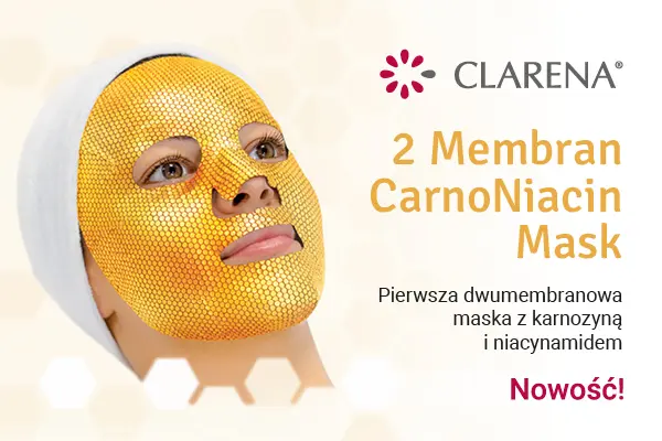 2 Membran CarnoNiacin Mask to pierwsza dwumembranowa maska z karnozyną i niacynamidem, zapewniająca nowy wymiar pielęgnacji skóry. Złota warstwa tworzy okluzję podnoszącą temperaturę skóry, zwiększającą wchłanianie składników aktywnych oraz chroniącą przed ich utartą. Miękka wewnętrzna membrana nasyca skórę karnozyną, niacynamidem i ceramidami. Kluczowym składnikiem maski jest karnozyna, która dzięki małej masie cząsteczkowej łatwo wnika do skóry. Dipeptyd neutralizuje działanie nadmiaru wolnych rodników, hamuje proces glikacji i posiada zdolność chelatowania niektórych metali ciężkich. Dodatkowo odżywia, nawilża i regeneruje skórę, stymulując wzrost fibroblastów. Niacynamid pobudza syntezę kolagenu oraz elastyny, odbudowuje uszkodzoną skórę, a także uszczelnia jej barierę hydrolipidową. Wszystkie te cechy sprawiają, że 2 Membran CarnoNiacin Mask jest nieocenionym produktem w profilaktyce przeciwstarzeniowej, dlatego na jej podstawie Clarena stworzyła zabieg karnozynowego odmładzania skóry.