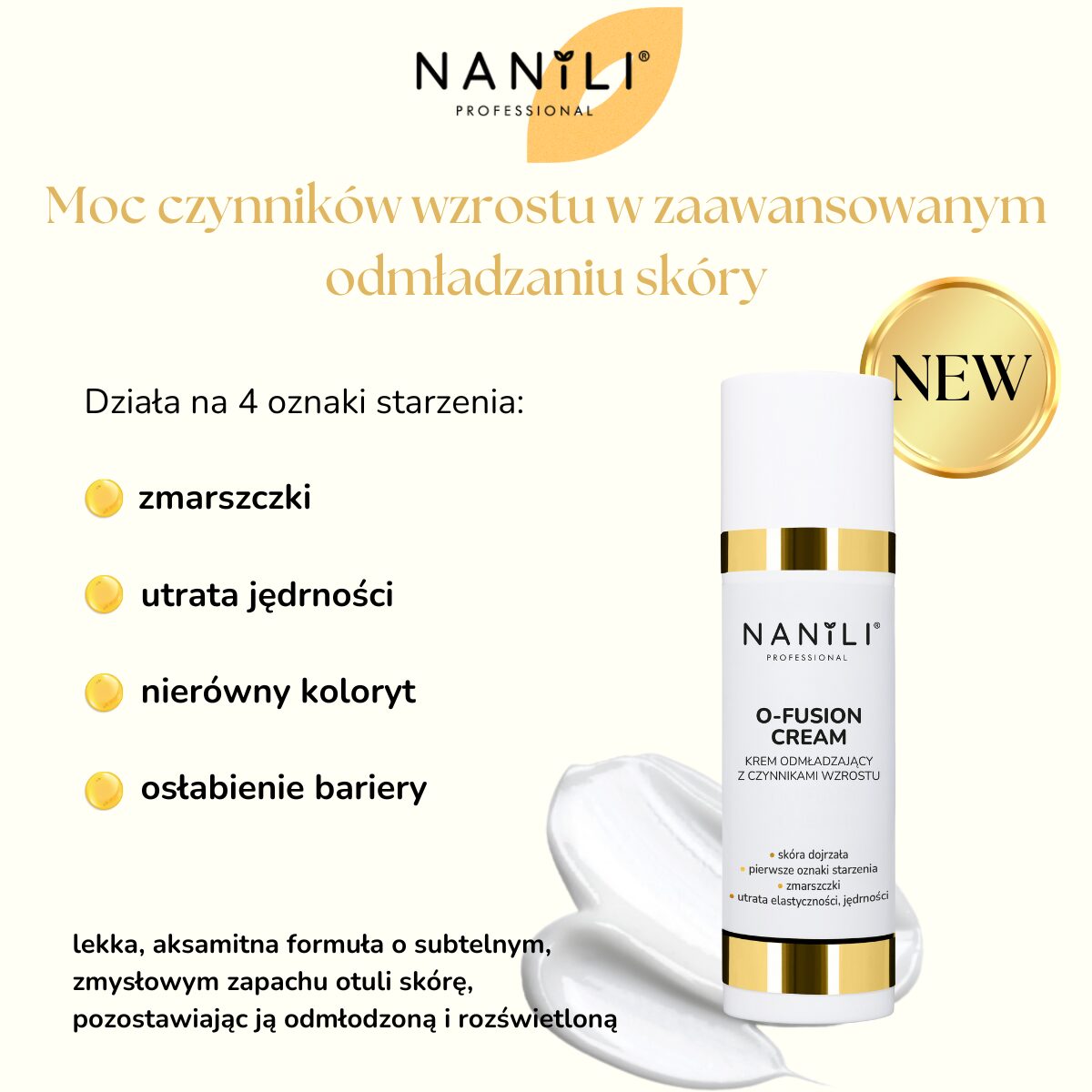 Odkryj O-FUSION CREAM, który przywraca skórze to co najcenniejsze – jej naturalną młodość i blask! Innowacyjna formuła opiera się na czynnikach wzrostu zamkniętych w oleosomach, która skutecznie działa na 4 główne oznaki starzenia: zmarszczki, utrata jędrności, nierówny koloryt i osłabienie bariery.
