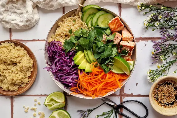 - W misce ułóż naprzemiennie wszystkie składniki – warzywa, komosę, rybę i awokado, tworząc kolorowy bowl.