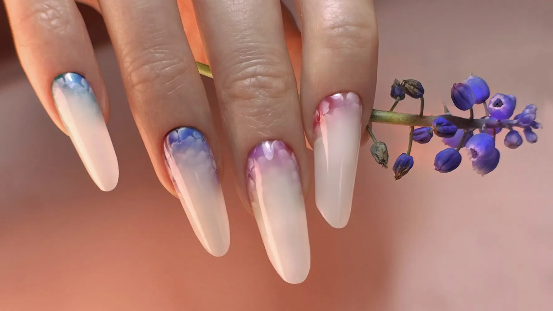 Wykonujemy ombre wybierając 2-3 kolory, które dobrze ze sobą współgrają. Nie utwardzamy pierwszej warstwy, tylko wykonujemy na niej zdobienie techniką “mokre w mokre”. Płatki malujemy białym żelem za pomocą pędzla w kształcie kociego języka. Utwardzamy 30 sekund.