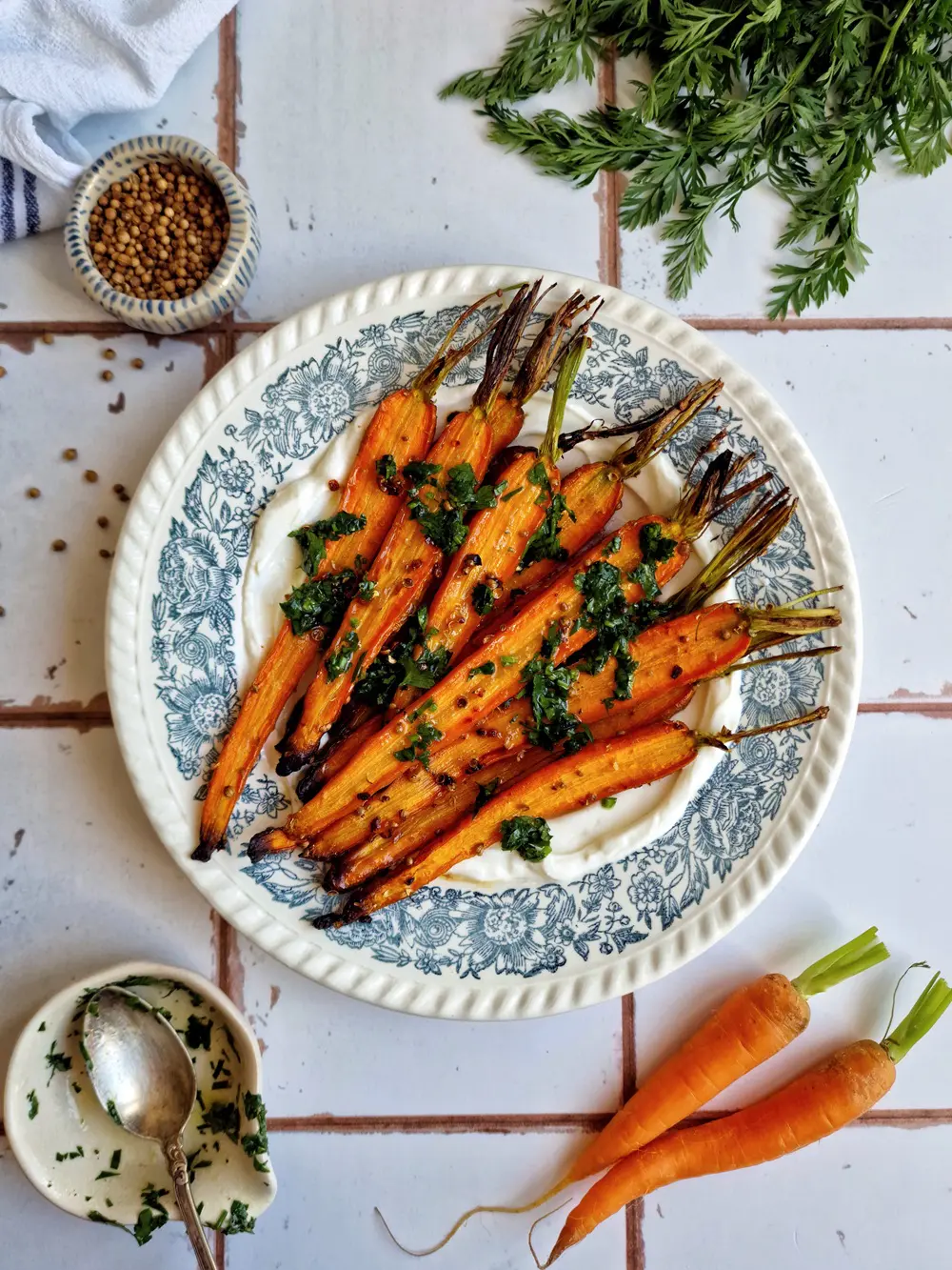 4. Na talerzu rozsmaruj labneh*, wyłóż porcję pieczonych marchewek i polej salsą pietruszkową.