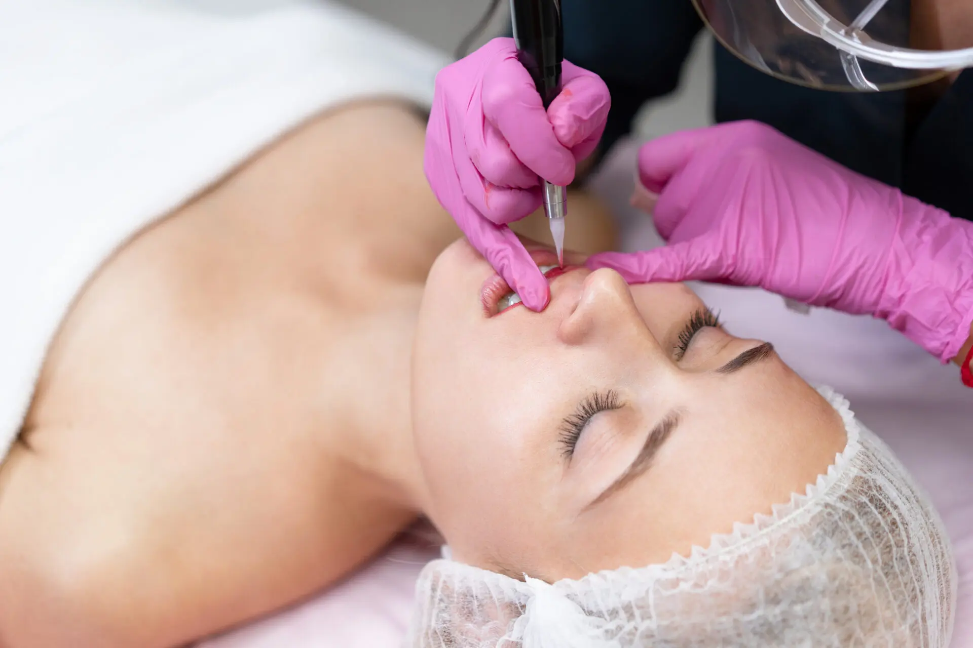Klientka leży na leżance w gabinecie kosmetycznym. Kosmetyczka nanosi kontur na usta. Przygotowanie do zabiegu makijażu permanentnego ust. Zbliżenie. Branża kosmetyczna