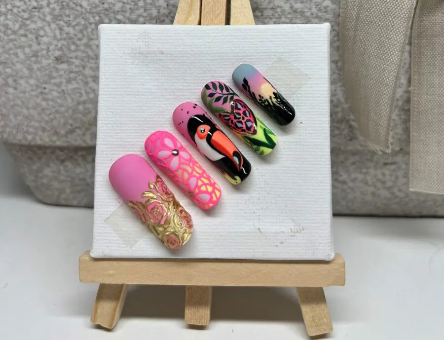 Paznokieć nr 3 – Po namalowaniu i wypełnieniu wszystkich elementów tukana całość paznokcia pokrywamy matowym topem i utwardzamy, następnie czarne elementy pokrywamy topem o błyszczącym wykończeniu, utwardzamy. Gotowe!