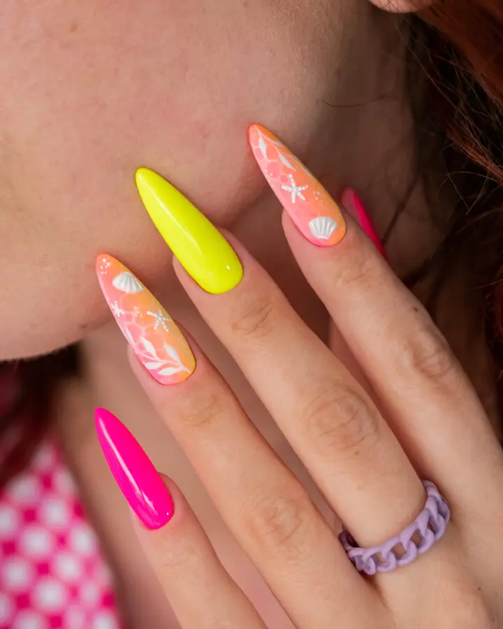 - Wykonujemy trzy kolorowe ombre w neonowych kolorach: żółtym, pomarańczowym i różowym.