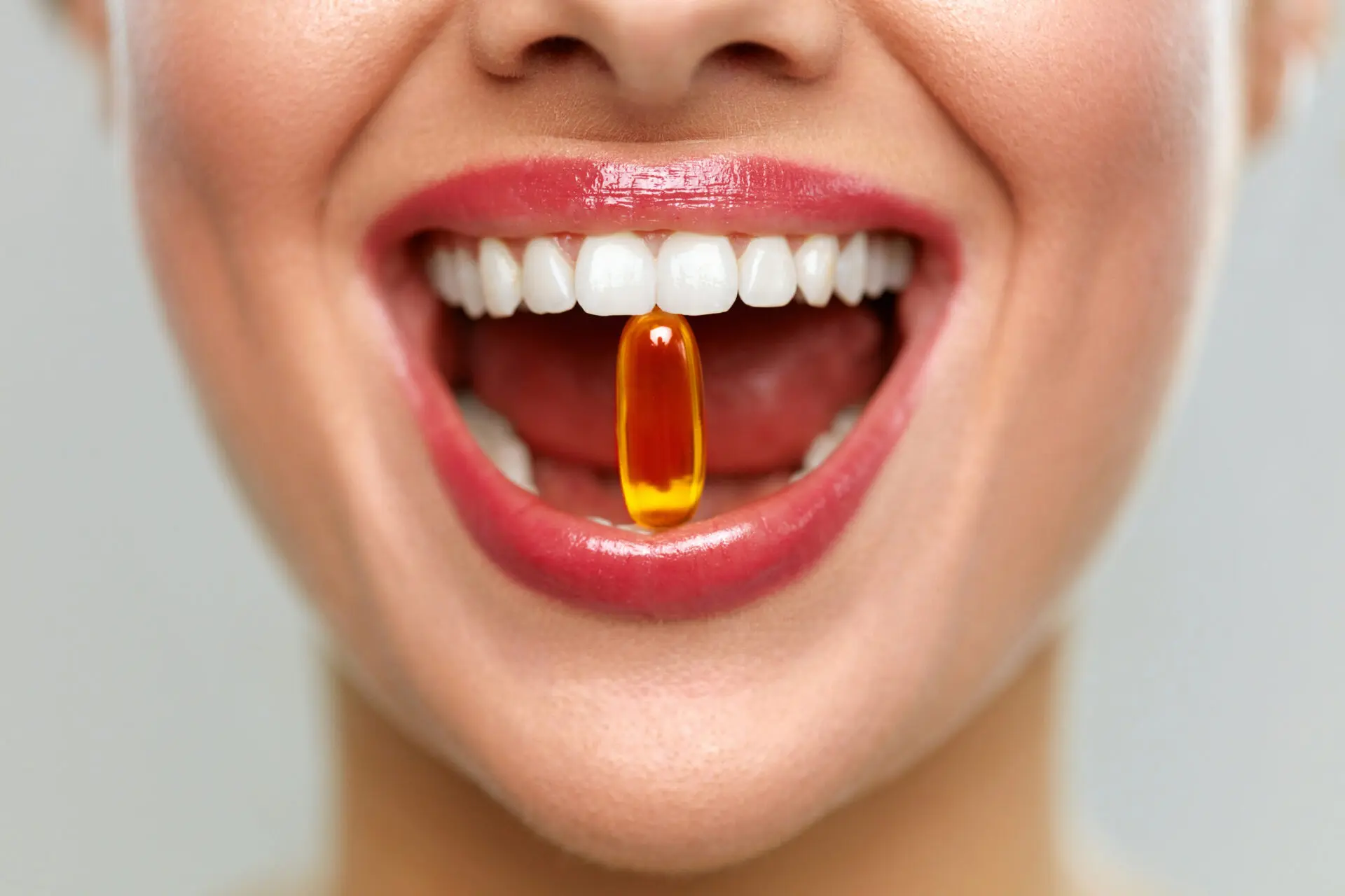 Na zdjęciu kobieta trzyma tabletkę w zębach